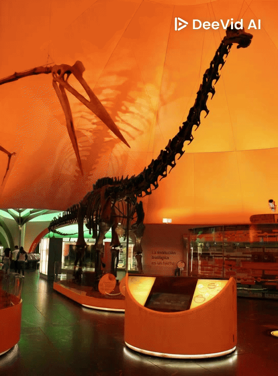 En tu recorrido por la sala, podrás observar un mural que sintetiza las eras geológicas desde el origen de la vida hasta la época actual, en el piso, claraboyas con fósiles que representan las extinciones masivas que han ocurrido en el planeta, y en el centro de este espacio, las réplicas del esqueleto del Diplodocus, un dinosaurio cuello largo que habitó en el Jurásico, y la de un reptil volador del Cretácico llamado Quetzalcoatlus en honor al dios aztecas Quetzalcóatl, así como representantes de la megafauna de la Edad del Hielo, como la réplica de una perezosa gigante entre otras sorpresas.